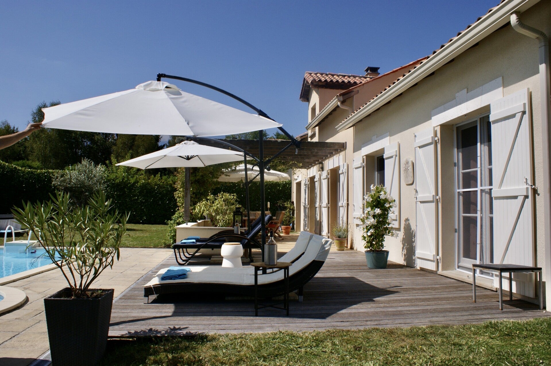 "Direct gelegen op een van de mooiste en spectaculairste golfbanen in Frankrijk, in de prachtige groene streek de Charente/Dordogne, bevindt zich deze luxe villa met privé zwembad."